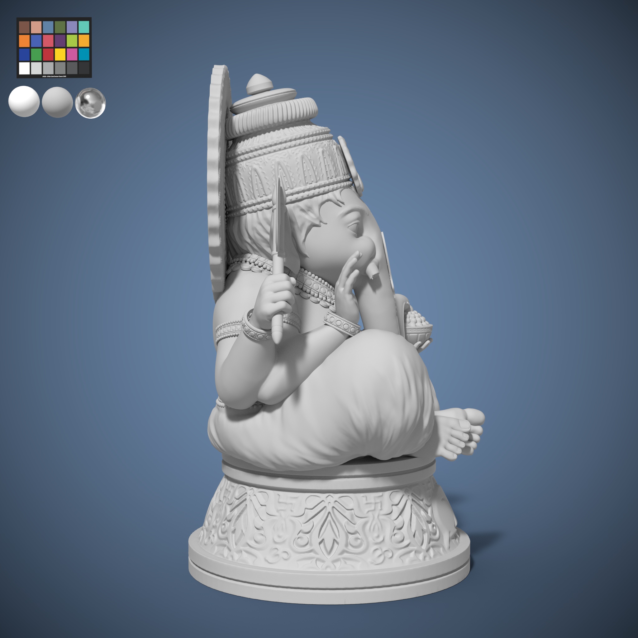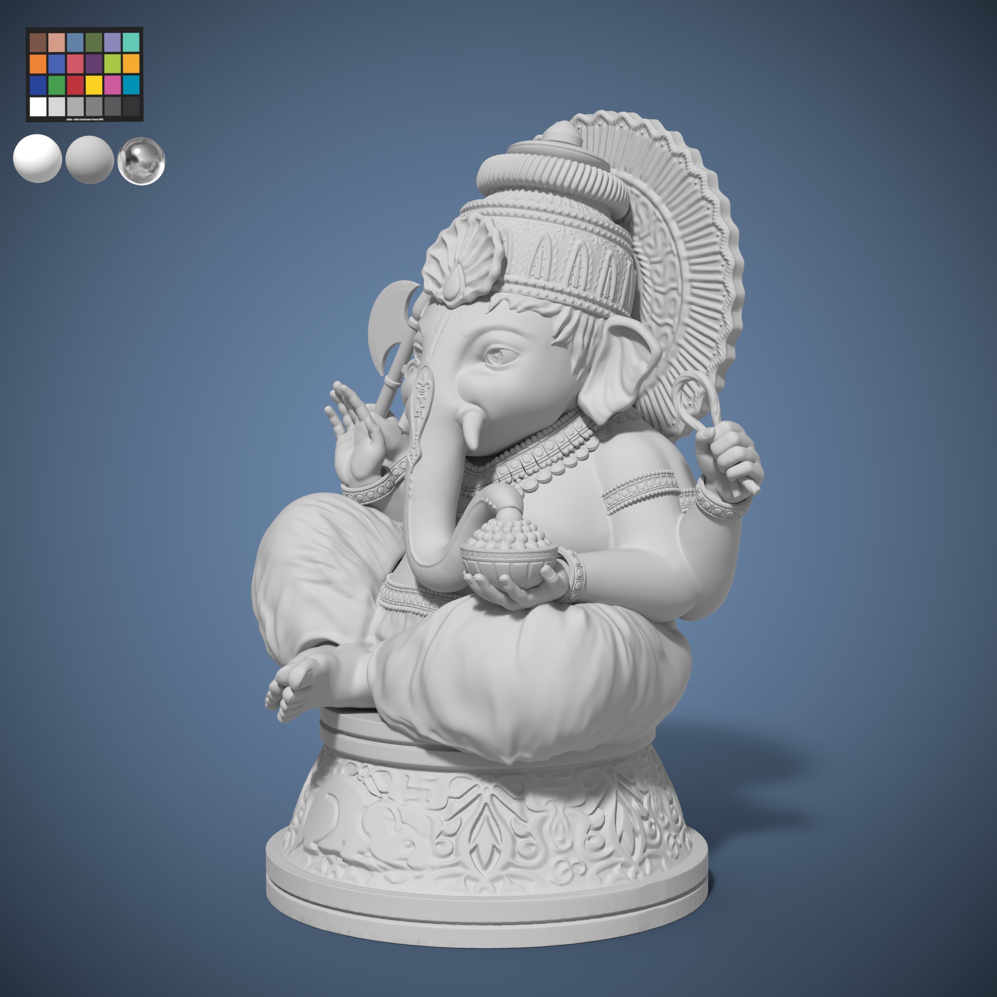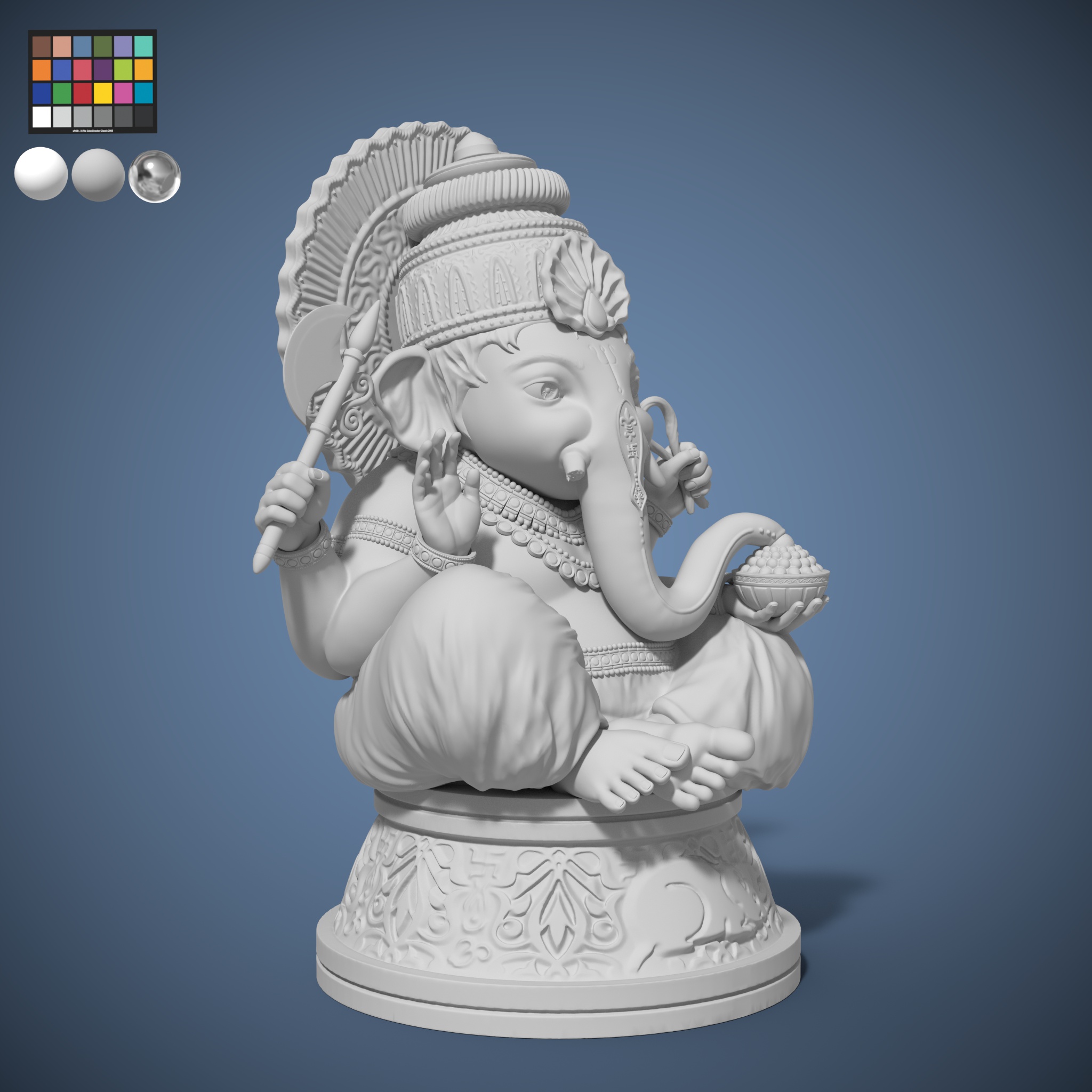 Sculpted in a 2.5D sculpting software ZBrush. It refers to a 3D digital model of a God Ganesha sculpted figure that has been created and manipulated in ZBrush, a popular sculpting and modeling software. This type of sculpt typically involves Anatomy Study, Pose Study, Detailing, ZBrush Tools and Rendering.