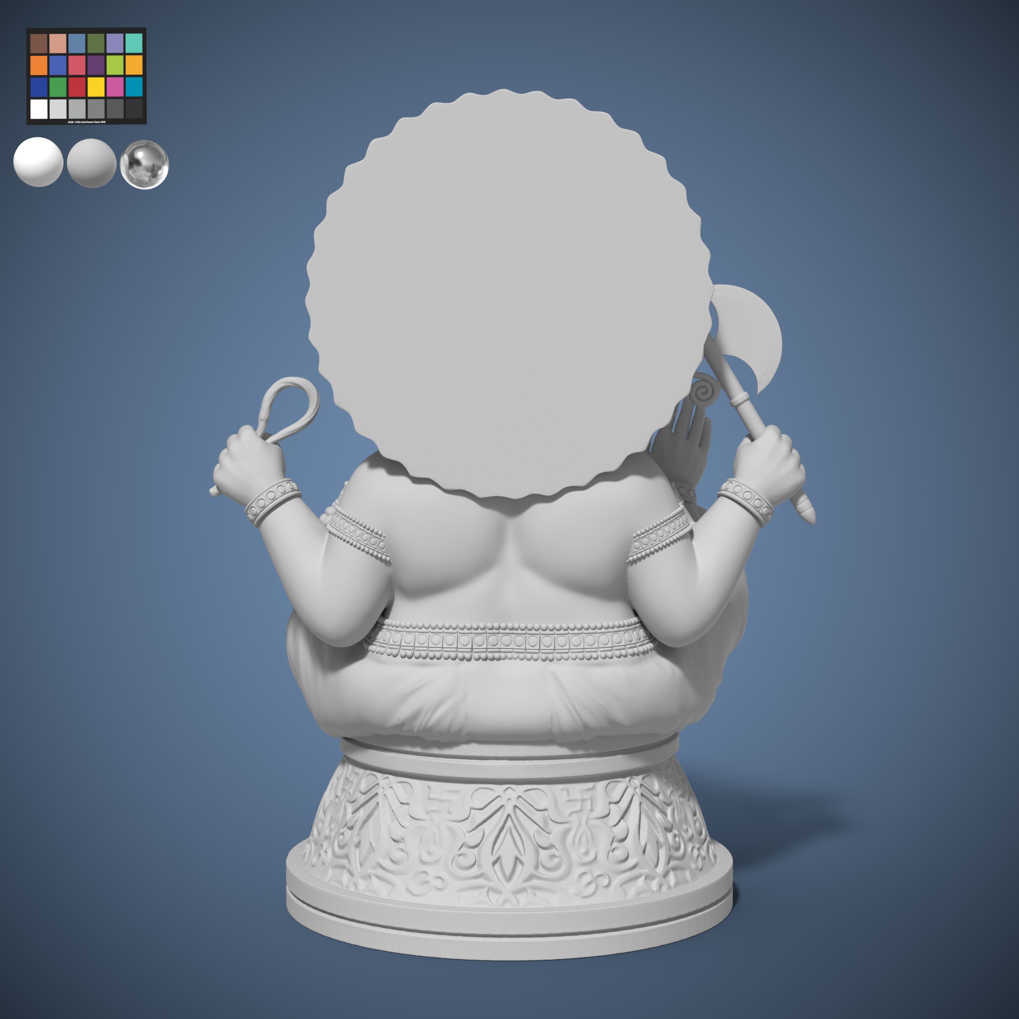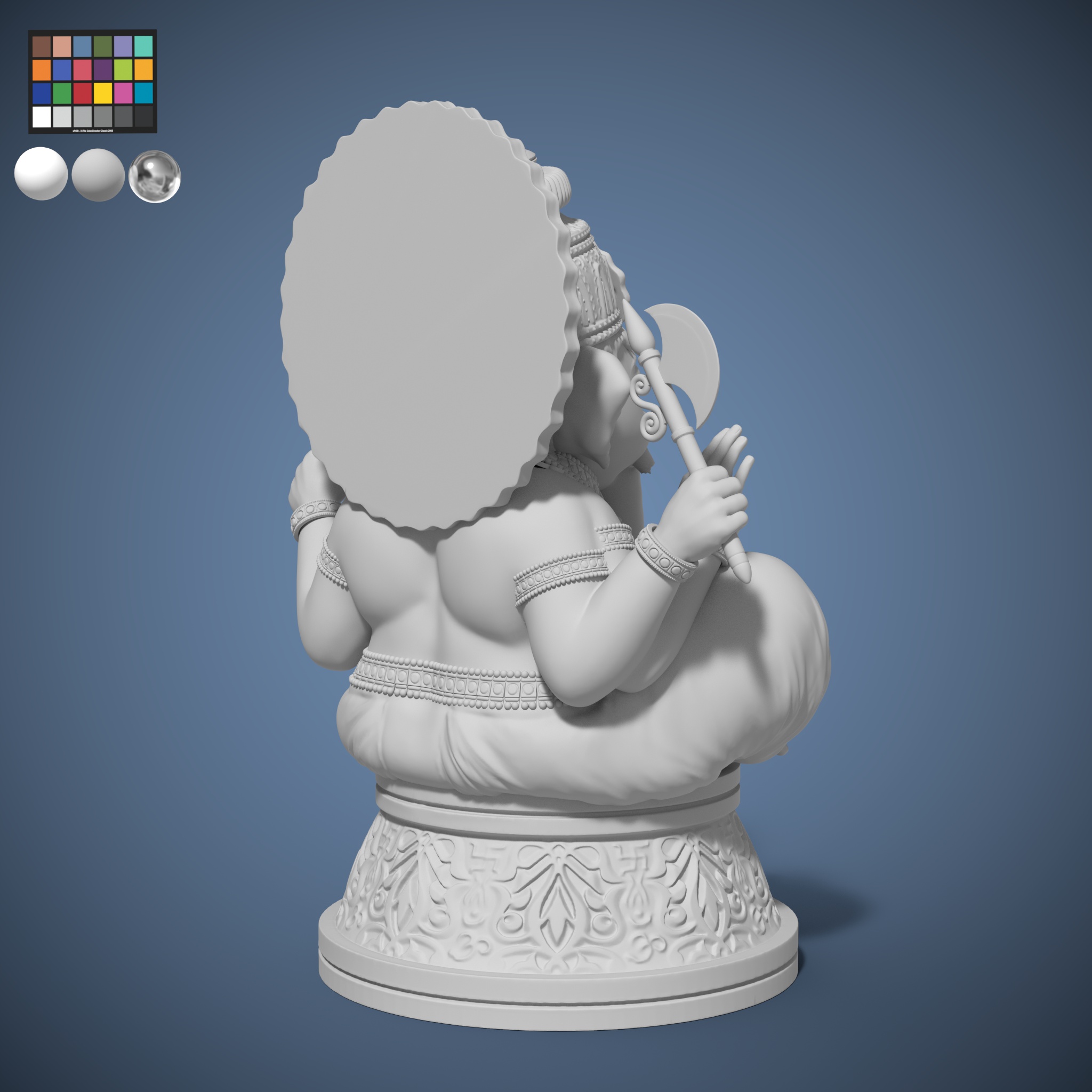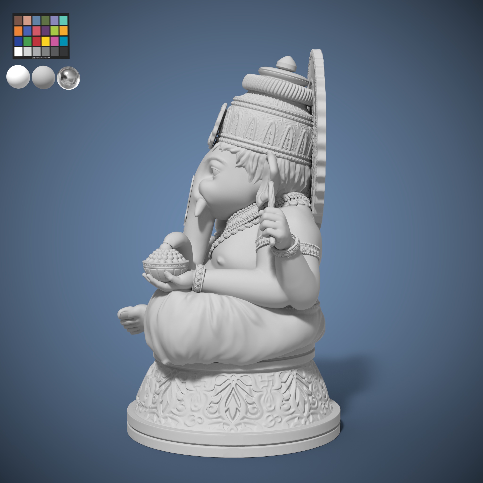 Sculpted in a 2.5D sculpting software ZBrush. It refers to a 3D digital model of a God Ganesha sculpted figure that has been created and manipulated in ZBrush, a popular sculpting and modeling software. This type of sculpt typically involves Anatomy Study, Pose Study, Detailing, ZBrush Tools and Rendering.